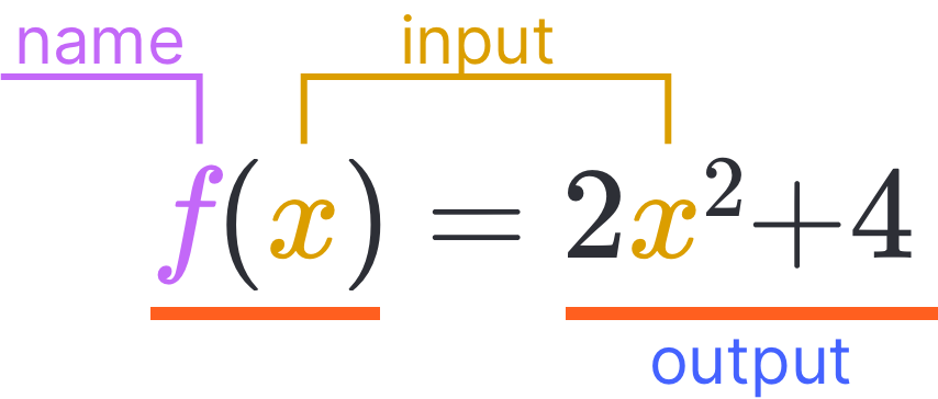 The function, named , takes some number as an input, squares it, multiplies by 2, and then adds 4 to produce its output.Check out our or explore our and sections to learn more about functions and test your understanding.